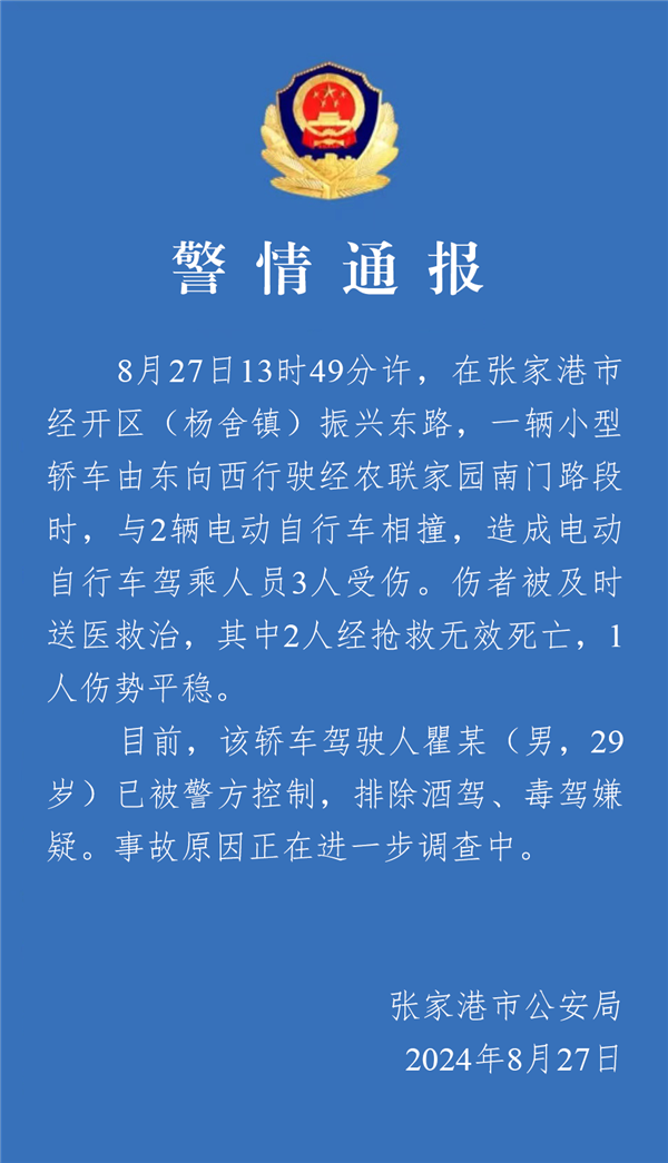 8月27日13时49分,在张家港市经济开发区(杨舍镇)振兴东路时,一辆小型轿车从东向西行驶在农联家园南门时,与两辆电动自行车相撞,造成3名电动自行车驾驶员受伤。