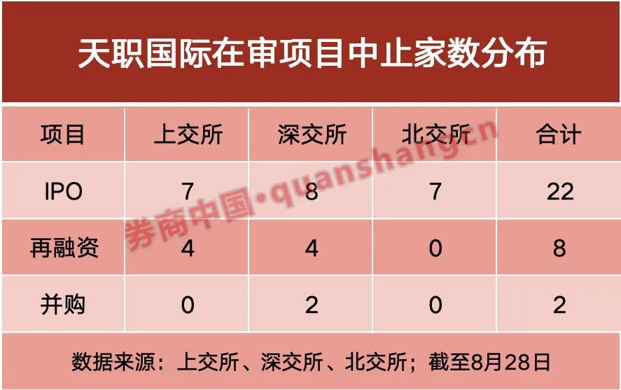 据券商中国记者统计,天职国际在上海证券交易所有11个排队项目,其中7个是IPO项目,4个是再融资项目;深交所有14个,IPO、再融资,并购依次有8个,4个,2个。以上25个在审项目全部中止。