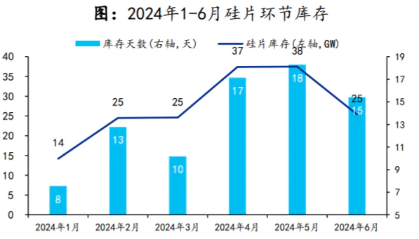 硅片公司的库存水平一般保持在一周左右的正常范围内。但是,自2023年下半年以来,库存开始逐步增加,2024年整体库存将增加到2-3周。6月份硅片库存明显下降,但整体库存天数仍较高。