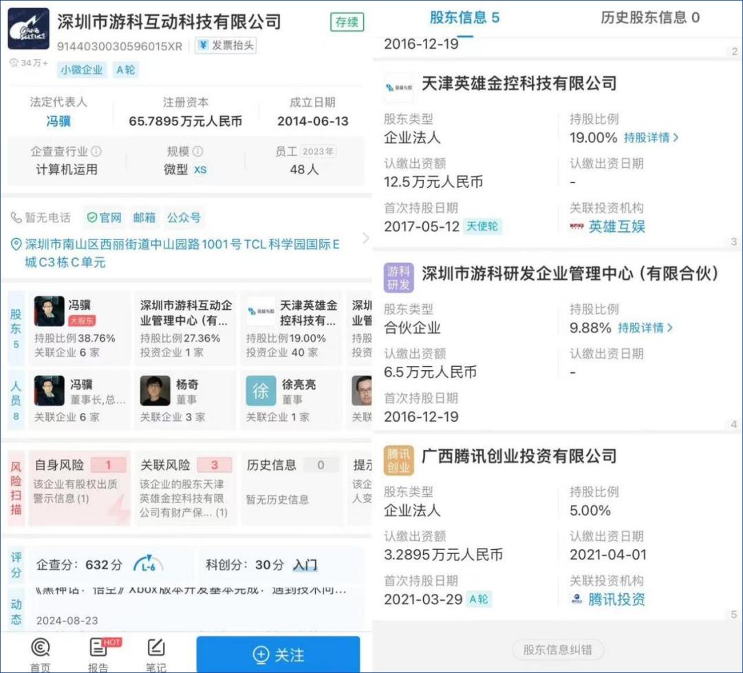 根据企业调查数据,深圳游戏互动科技有限公司是游戏科学的主体,其大股东为冯邈,持股比例为38.76%。据公开资料显示,2017年5月,天津英雄金融控制科技有限公司(英雄科技有限公司全资控股)作为天使轮投资者,投资游戏科学6000万元,持股比例为19%。