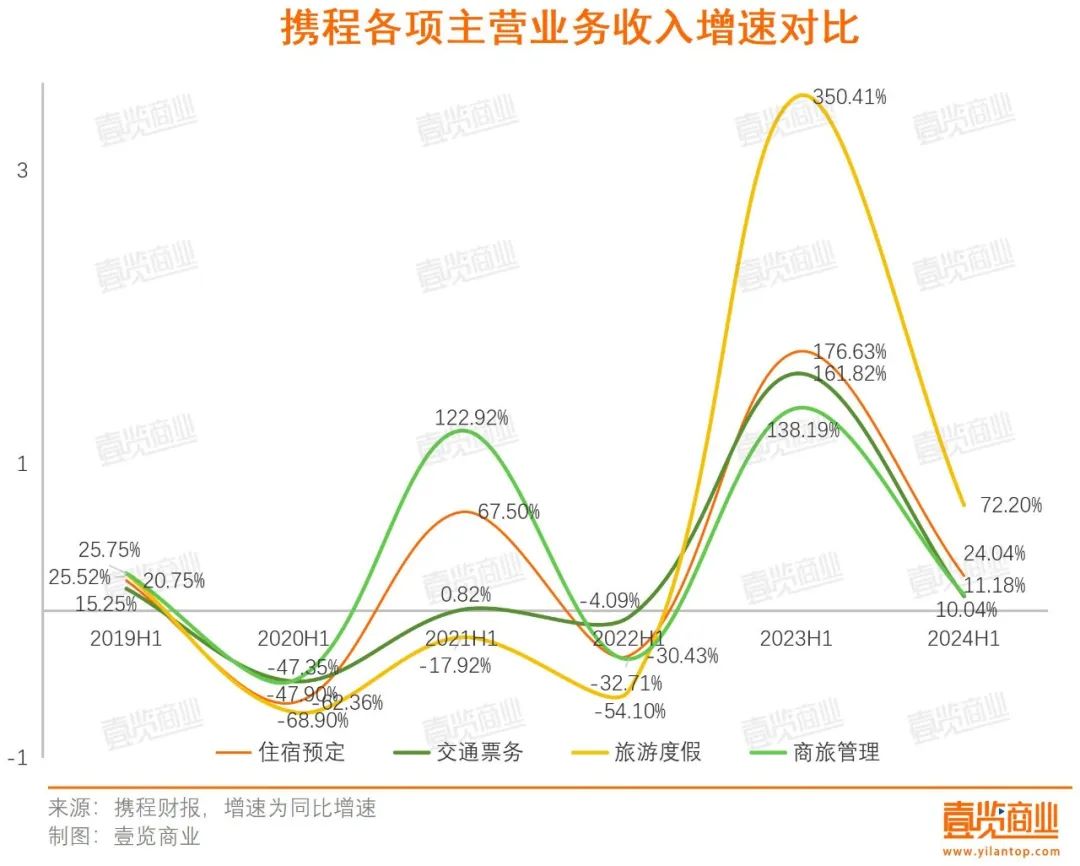 其中,休闲度假业务的表现尤为引人注目。作为携程业务体系中波动最大的板块,受出境旅游政策的影响,凸显了对特定领域在业务结构上的强烈依赖。虽然休闲度假业务在疫情放开后迅速反弹,成为增长最快的业务范围,但与2019年同期相比,该板块仍有9%的下滑,表明其尚未完全恢复到疫情前的水平。