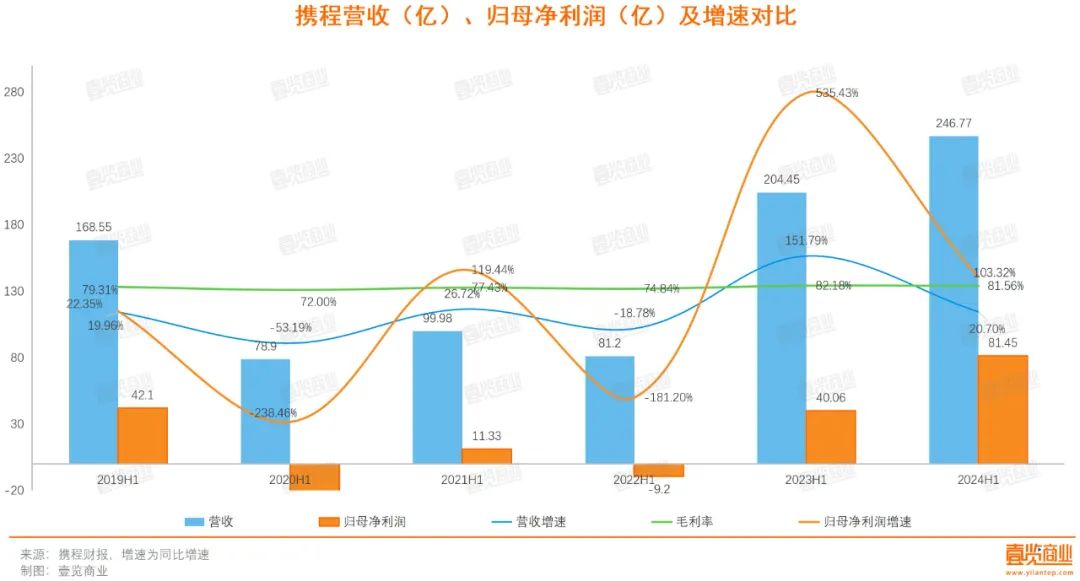 根据半年报,携程上半年总收入约为246.77亿元(人民币,相同),同比增长20.7%,归母净利润为81.45亿元,同比增长103.32%,毛利约201.27亿元,同比增长19.8%。上半年总收入比2019年同期增长46.41%,归母净利润增长93.47%。