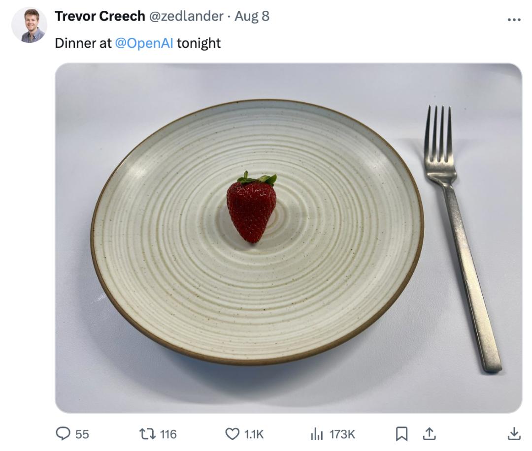 除Altman秀5个草莓外,OpenAI研究员Trevor Creech在OpenAI吃晚饭,盘子里有草莓。