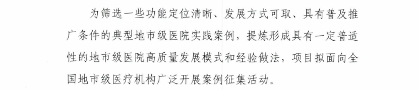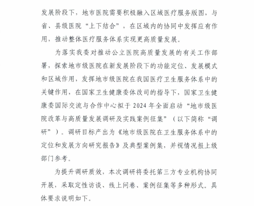为了全面研究了解全国地级医院改革和高质量发展现状,听取地级医院在改革和高质量发展方面的意见反馈和意见,项目组近日启动了一系列研究工作,邀请全国地级医院积极参与。活动要求和参与说明请参考以下红头文件《国家卫生健康委国际交流与合作中心邀请参加地级医院改革和高质量发展调查和实践案例征集函》。