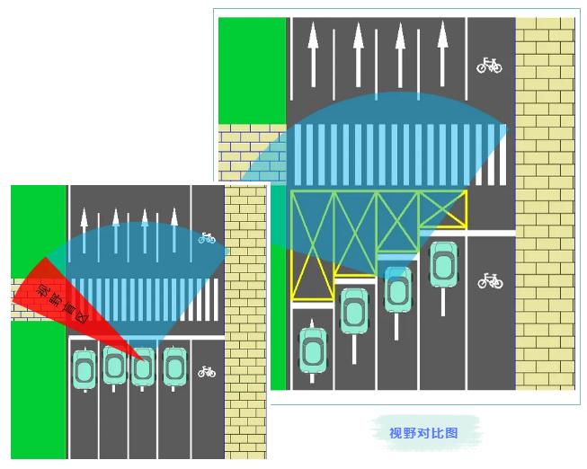 阶梯式停车线的设置,大大提高了机动车的安全性,有效地防止了视觉盲点,增加了距离。