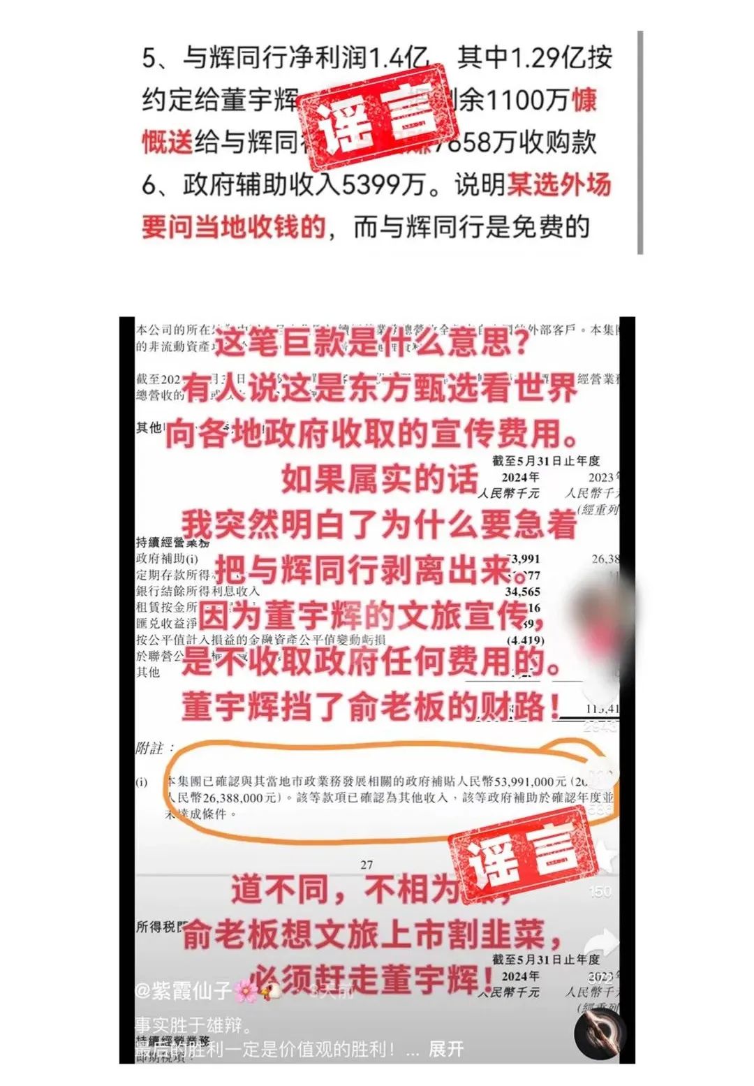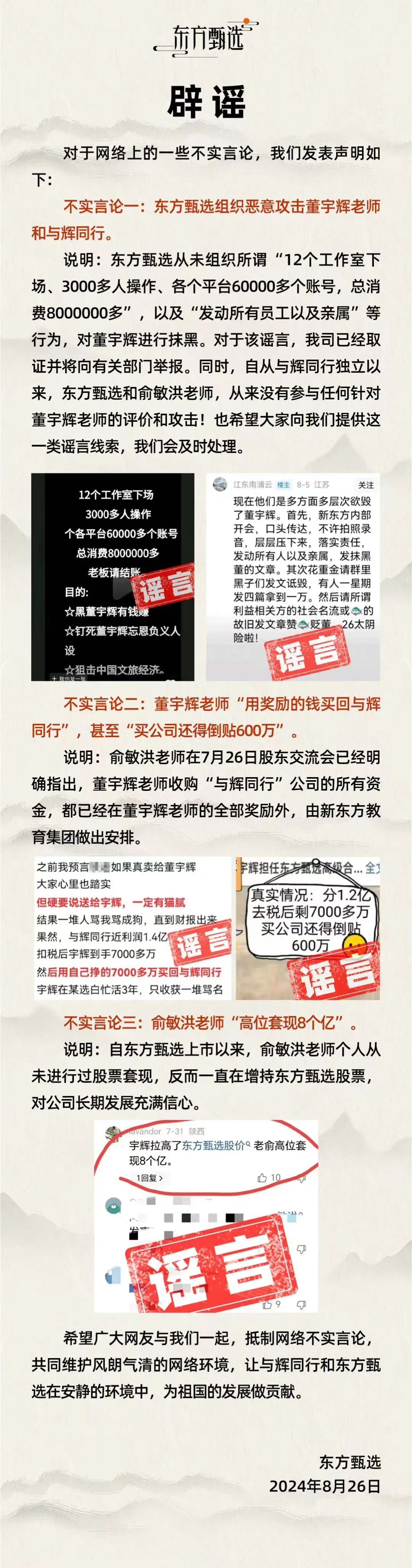 八月二十七日晚,东方选举再次发文辟谣:近日,“说书人土土”、根据东方财务报告的内容,“紫霞仙子”等自媒体恶意编造谣言,称“某选外场要向当地收钱”、"向各级政府收取宣传费用"、董宇辉挡住了俞老板的财路。这是网民朋友对东方选择的误解。
