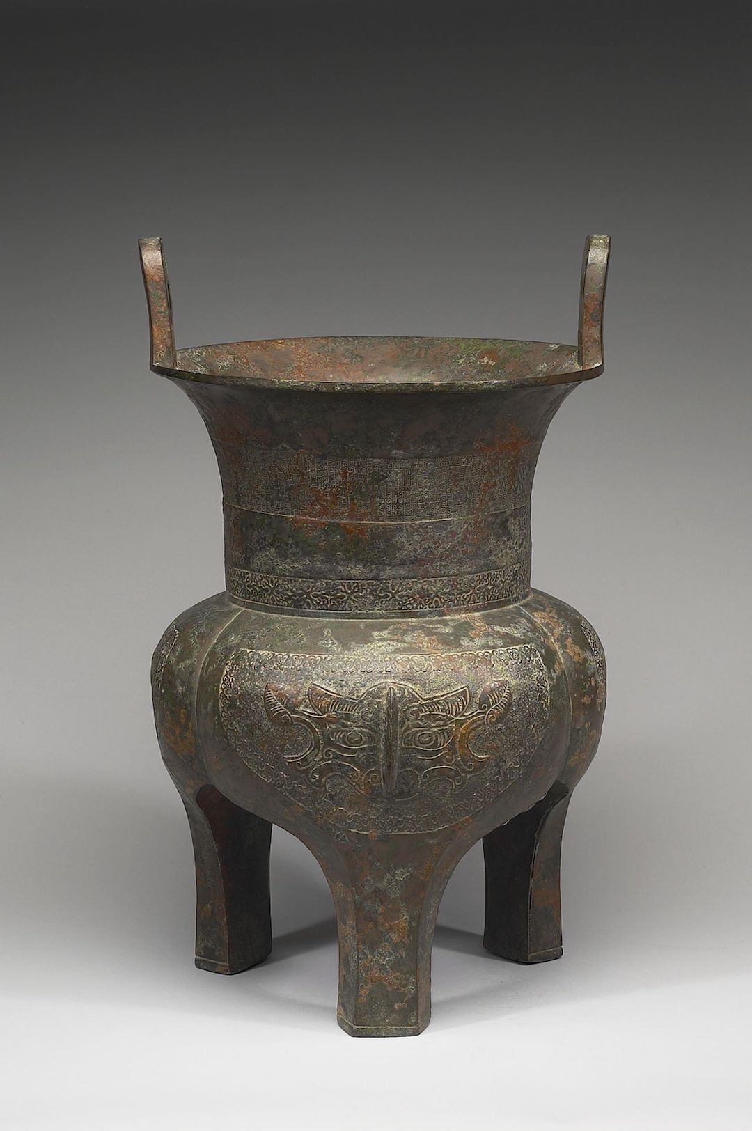 本来就是商周时期的黄铜炊具,上部称为蒸汽,下部称为蒸汽。在水中加热,上升的蒸汽将蒸汽中的食物蒸熟。这一开始没有封底,也没有蒸盘,所以不能装水,不能放食物。从平板化兽面纹、花朵变形云纹、螺旋雷纹等方面,可以看出是宋代作品。内壁有符文,源于《宣和博古图》〈仲驹父敦〉符文,两者属于不同的器类。此后又焊接了底端,推断是明代晚期为“恢复”原貌而进行的再加工。宋明两代对古代黄铜的想象叠加在一起。