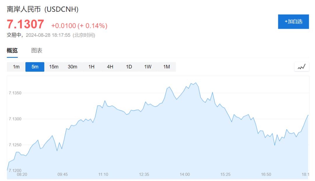 目前,离岸人民币对美元汇率为7.1307,日内下降0.14%。