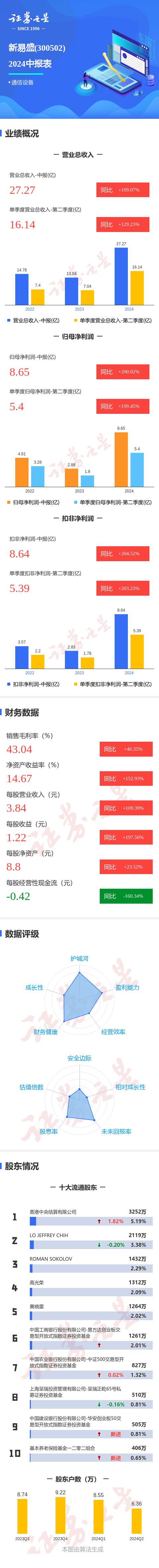 证券之星消息,新易盛 2024 年中报告显示,公司主要收入 27.28 亿元,同比增长 109.07%;归母净利 8.65 亿元,同比增长 200.02%;扣非净利润 8.65 亿元,同比增长 204.52%;其中 2024 2008年第二季度,公司单季度主营收入 16.15 亿元,同比增长 129.23%;单季度归母净利润 5.41 亿元,同比增长 199.45%;单季度扣除非净利润 5.4 亿元,同比增长 203.23%;负债率 投资收益24.81% 105.6 一万元,财务费用 -6741.96 万元,毛利率 43.04%。
