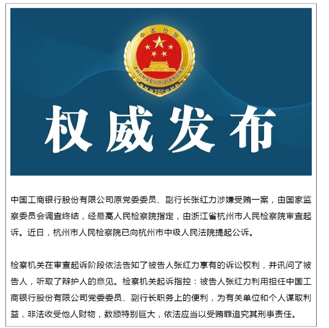 凤凰网财经讯 8月29日,据最高人民检察院消息,中国工商银行股份有限公司原党委委员、副行长张红力涉嫌受贿案由国家监察委员会调查结束,浙江省杭州市人民检察院经最高人民检察院指定审查起诉。近日,杭州市人民检察院向杭州市中级人民法院提起公诉。