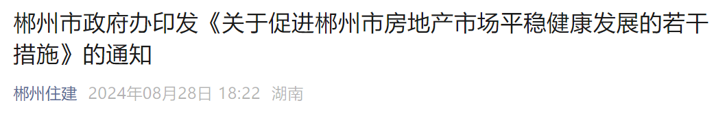 8月28日,据“郴州市住房和城乡建设”微信官方账号消息,郴州市政府办公室发布《关于促进郴州市房地产市场稳定健康发展的若干措施》通知。