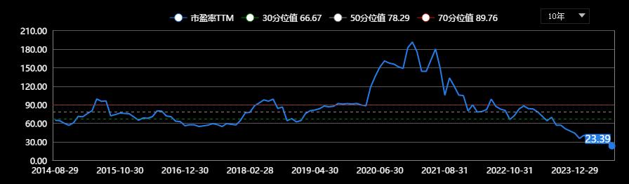但是随着市场的上涨,爱尔眼科的估值拐点出现了,企业开始了一轮估值调整。爱尔眼科最新市盈率(TTM)不到24倍,已经跌至近10年30分(66.67倍)以下。