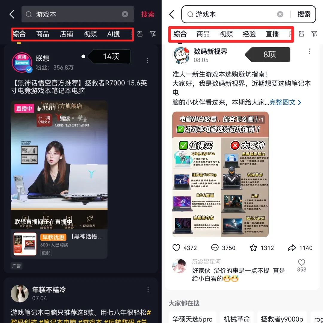 差异主要表现在细节上。当你输入“游戏本”进入二级页面时,你会发现Tiktok的搜索框下有14个小项目,而Tiktok的搜索框下只有8个,没有AI搜索、店铺、团购、小程序讨论等功能入口。另外,直播在TikTok中的权重比在TikTok搜索中更重要,有些商家的直播并没有出现在TikTok搜索的综合信息流中,只有点击独立的直播界面才能看到。可以看出,商品类关键字和内容类关键字在推荐上仍然存在一些差异。