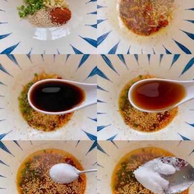 2、调汁:碗中加入葱花蒜末,辣椒面和芝麻,淋热油,再加入葱花蒜末, 2 勺生抽,1 勺醋,少量盐和糖,搅拌均匀。