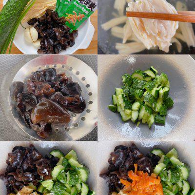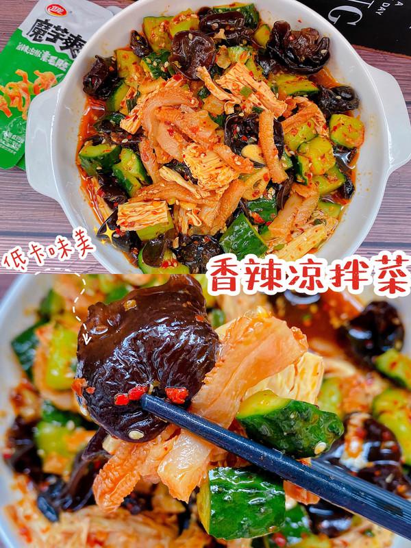 1、准备好所有的配料,木耳和腐竹早泡,开水焯一下。 1 每分钟捞出备用。 将黄瓜洗净切成小块,准备好的木耳和腐竹控干水分切成小块,放入大碗中,再加入麻辣味魔芋爽备用。