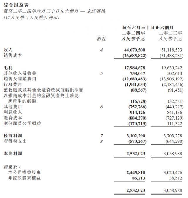 毛利率:由于上半年收入下降,本集团期间毛利下降至人民币 179.847 亿元。由于原奶价格下降,毛利率同比上升。 1.9% 至 40.3%。