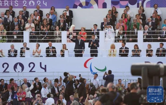 ↑安德鲁·帕森斯(前排左六)和法国总统马克龙(前排左七)国际残奥委会主席向观众问候。新华社记者 侯昭康 摄