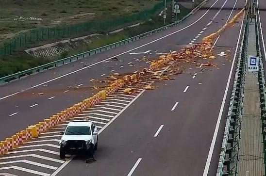 8月22日11时许,一辆轻型卡车在银百高速公路74公里处与防撞桶发生碰撞。卡车前部严重受损,无法正常行驶。道路左侧的防撞桶损坏了一排,现场一片混乱。