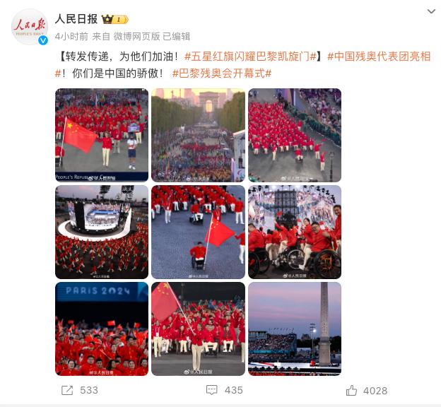 “中国红”入场!中国体育代表团在巴黎残奥会开幕式上亮相
