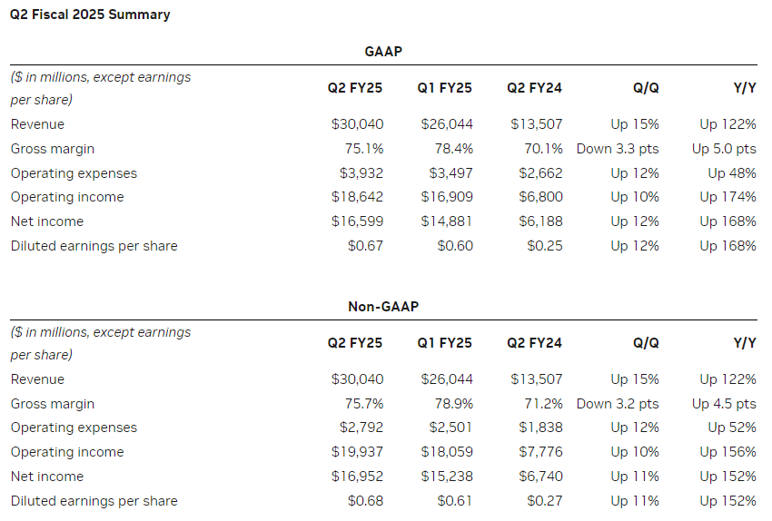 英伟达当地时间8月28日盘后(Nasdaq:NVDA)截至6月28日,2025财年第二财季财报公布,实现营收300.40亿美元,同比增长122%,高于市场预期的286.68亿美元;净利润165.99亿美元,同比增长168%;非美国通用会计准则(non-GAAP)每股摊薄收益为0.68美元,同比增长152%,高于预期的0.64美元。