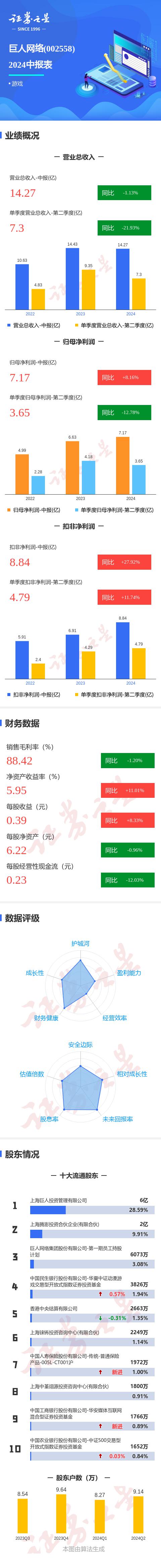 图解巨人网络报告:第二季度净利润同比下降12.78%