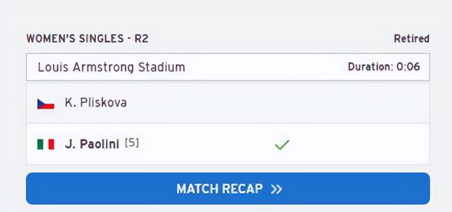 不过,比赛刚开始,就早早宣布结束,开始只是开始, 6 分钟,在第一场比赛结束之前,普利斯科娃意外受伤,随后选择弃赛,鲍里妮自动晋升女单。 32 强者,而鲍里妮下一轮的对手,就是“以小打大”淘汰中国名将王欣瑜的普丁塞娃。