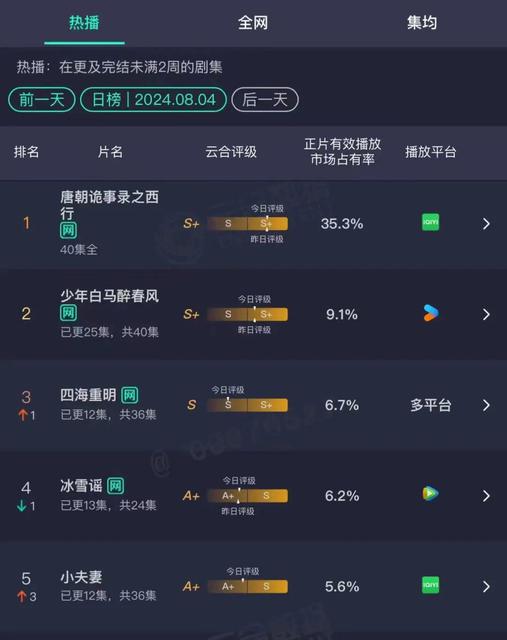 在《唐诡西行》播出期间,在整个灯塔电影播放量排行榜上不断领先,8 月 4 日会员收官当天,云合数据显示,其市场份额已达到 35.3%之后,仍然存在。 6 天空继续位居榜首。就热度而言,《唐诡西行》 8 月 2 日至 5 一天又一次突破一万,但在同期的奥运会上,包括枪击、网球、体操和中国人高度关注的暴跌。换句话说,金牌热并没有影响观众的追剧心。用粉丝的话来说:强者从不抱怨环境。
