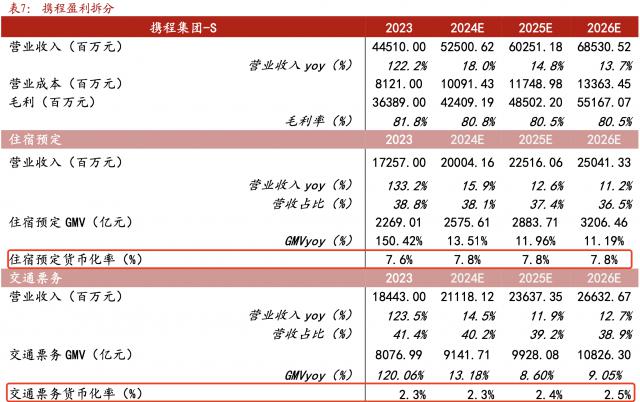 虽然住宿业务在同程的收入结构中所占的比例仅仅是 远低于交通票务业务的28% 41%,但是住宿业务的变现率远远高于交通业务。2017年,根据同程披露的数据 年度住宿业务变现率高达 11%,是交通业务 3% 变现率的 3.7 倍。携程也是如此,根据浙商证券在一份研究报告中的利润拆分,2023年 携程每年的住宿预定变现率为 7.6%,是交通票务业务。 3.3 倍。