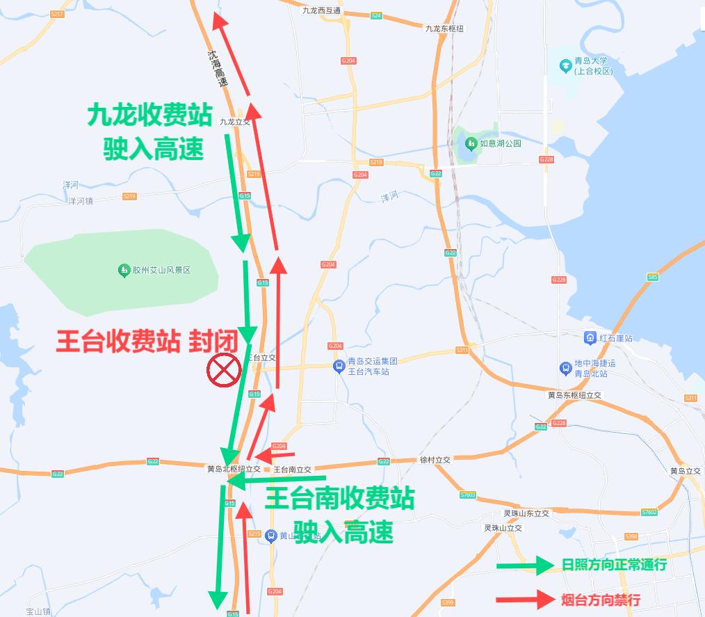2.原本计划从王台收费站行驶的车辆,可以选择G15九龙收费站提前行驶,也可以选择王台南收费站通过黄岛北立交沿着G22青兰高速青岛行驶。