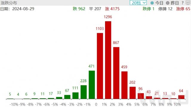 就个股涨幅分布而言,上涨企业数量 4100 多家企业,涨停企业数量 65 家庭,企业数量下降 900 多家企业,跌停企业数量 1 家庭,市场呈现普遍上涨趋势,人气大幅回升。