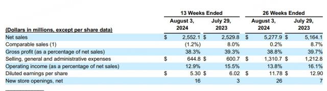 8 月 30 日,Ulta 美容发布 2024 2008年第二季度业绩。财务报告显示,第二季度营业收入 25.5 十亿美元,分析师期待 26.2 去年同期,亿美元 25.3 一亿美元;净利润 2.526 去年同期,亿美元 3.001 亿美元;每股收益 5.30 分析师期望的美金 5.50 去年同期的美元 6.02 美金。