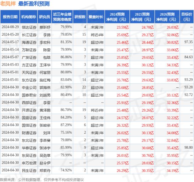 利润预测与投资评级:老凤祥是我国头部黄金首饰品牌,品牌力强,渠道积累深厚,2024 2008年上半年,黄金价格的快速上涨对加盟商的购买节奏产生了一定的影响,进而对收入和利润产生了一定的影响。 2024 年 -2026 年归母净利从 26/30.8/36 亿元至 23.4/26.2/28.6 亿元,最新收盘价对应 2024-2026 年 PE 分别是 11/10/9 保持“买入”评级倍。