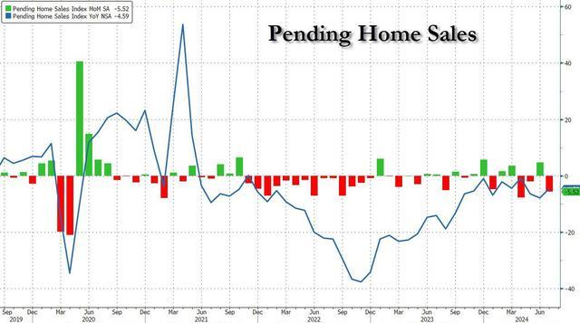 虽然抵押贷款利率已经降到了一年多的低点,但美国房地产市场的领先指标——房屋签约销售仍然低迷,7月份已经跌到了有记录的最低水平。由于房价高,贷款成本仍处于较高水平,尽管有所下降,客户继续被吓退。