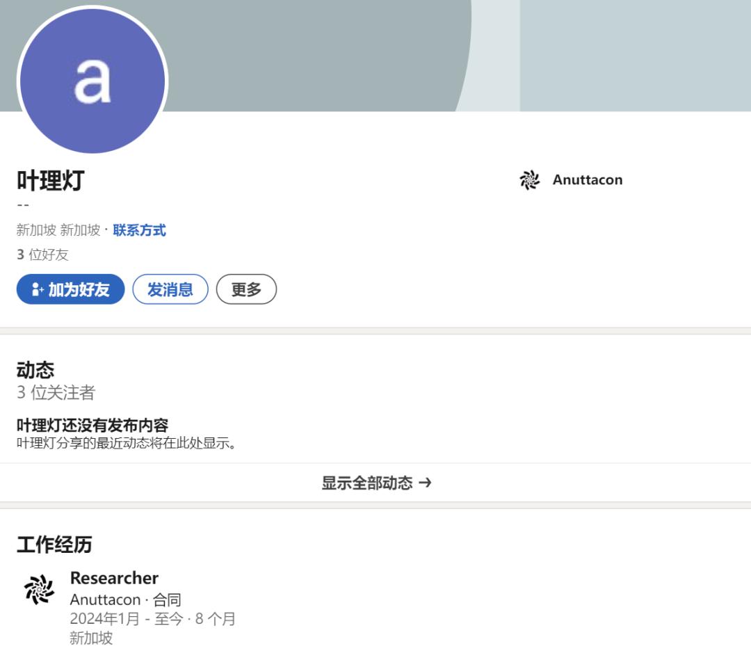 另一个领英界面显示,在Anuttacon工作的老板叶理灯曾在腾讯、盛大云等互联网公司工作,从事海量分布式后台系统的研发和运营。他还负责UCloud创新产品的研发,专注于企业云计算产品的研发和运营。