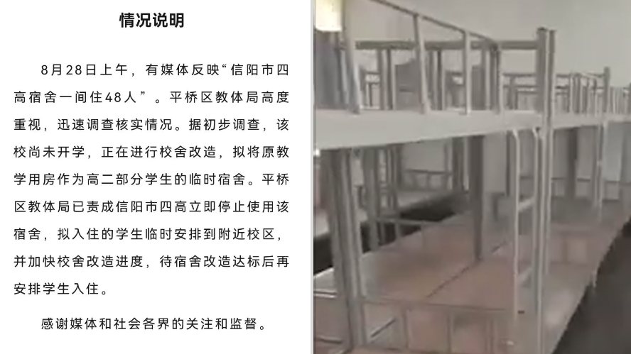 据媒体报道,河南省信阳市平桥区教育体育局近日公开回应“信阳市四高宿舍48人居住”。官方报告称:“信阳市四高尚未开学,正在进行校舍改造,计划将原教学用房作为一些高二学生的临时宿舍。平桥区教育体育局已责成信阳市第四高中,立即停止使用宿舍。拟入住的学生临时安排在周边校区,加快校舍改造进度。宿舍改造达标后,将安排学生入住。”