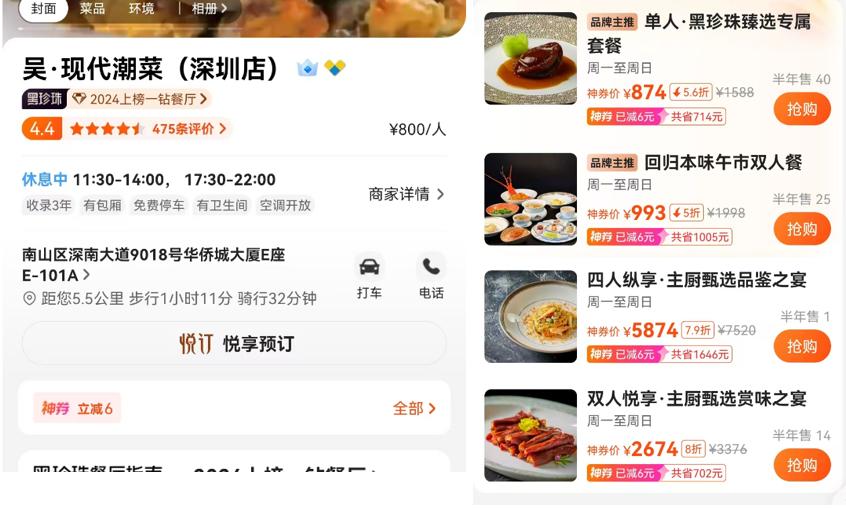 以深圳城市为例。2024年,黑珍珠钻石餐厅上市。现代潮菜华侨城大厦店在美团推出了四个聚会套餐,其中单人餐原价1588元,优惠券价格874元,直接打五六折;两人回归原套餐原价1998元,优惠券价格993元,直接打五折。其他套餐也差不多,甚至厨师选的两大套餐也打八折左右。