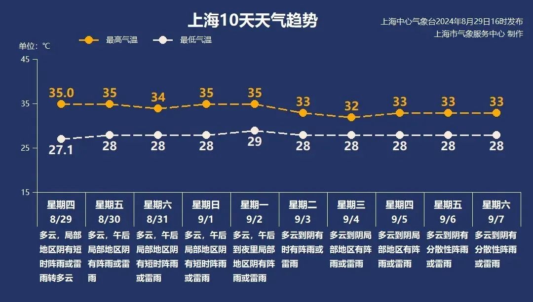 从今天开始,西环的大陆高压和东侧的副热带高压再次复合。未来4~5天,副热带高压将稳定控制我国长江流域。直到9月2日,上海的最高气温在35℃周围,最低气温在28~29℃。在防暑降温的同时,也要注意下午突如其来的短时雷暴。