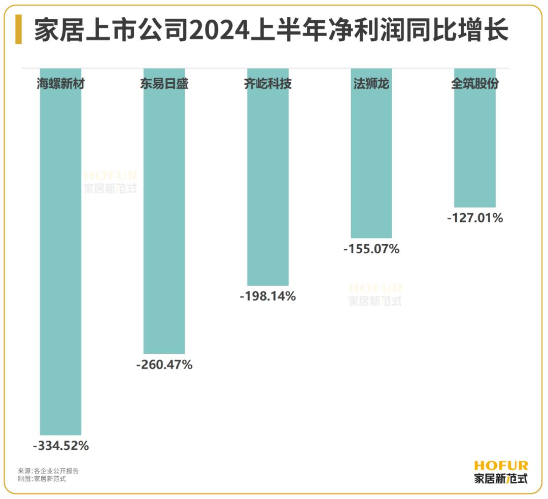65家公司里,40家公司净利润下降,占62%。,排名前五的分别是海螺新材料、东易日盛、齐屹科技、法狮龙、全建股份,净利润分别下降334.52%。、260.47%、198.14%、155.07%、127.01%。特别是东易日盛上半年亏损高达5.4亿元。