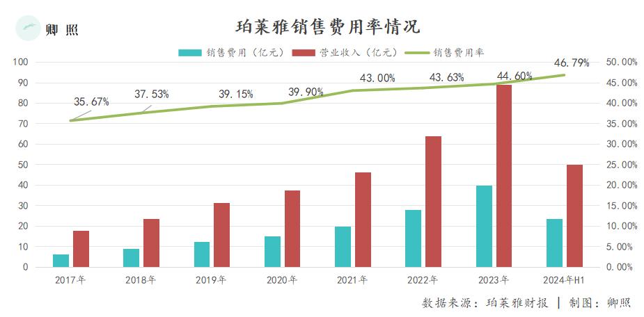 从长远来看,销售费用一直是珀莱雅的一大支出, 从2017年到2024年,H1的销售费率增长了10%以上,过去几年的高收入增长基本上与销售投入的增长相匹配。