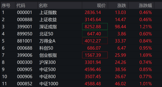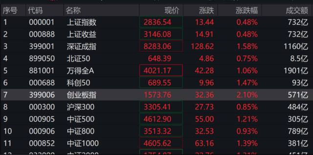 深成指、创业板指双双上涨2%以上,上证指数上涨0.48%。