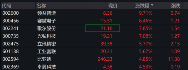 消费电子板块持续上涨,折叠屏、AI眼镜、智能穿戴领先,智能动力、奋达科技、科森科技、深圳科技、维信诺、凯盛科技、日久光电等十余股涨停,英唐智能控制、博士眼镜、捷邦科技、精研科技等多芯涨幅超过10%。