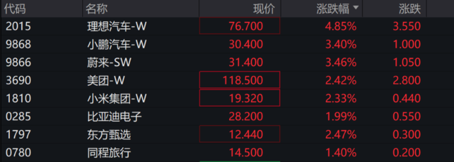 恒生技术指数盘上涨2%,理想汽车、小鹏汽车上涨6%以上。