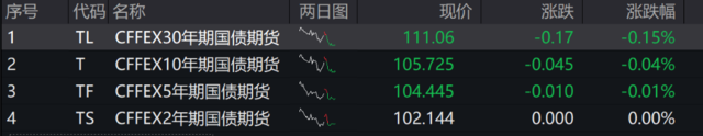 国债期货开盘时,主合约在30年内上涨0.19%,主合约在10年内上涨0.08%,主合约在5年内上涨0.03%,主合约在2年内上涨0.00%。