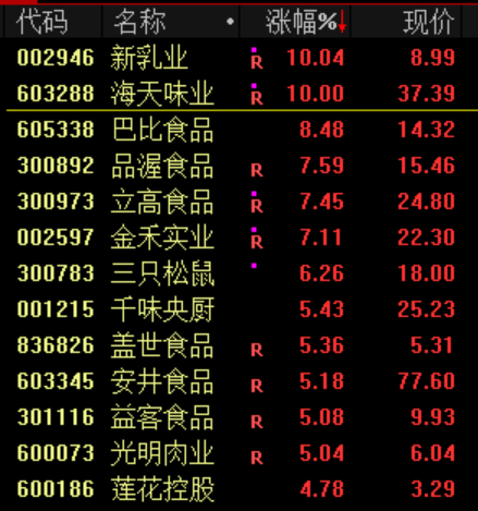 消费股如食品震荡上涨。海天味业、新乳业涨停,巴比食品、立高食品、品渥食品、三只松鼠等涨幅超过6%。