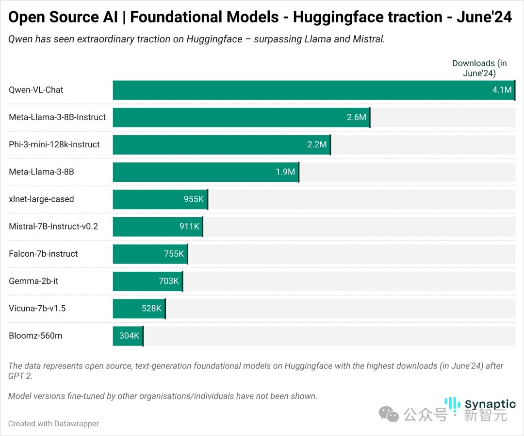 Qwen经过大量的数据预训练,于2024年6月在Huggingface 在Traction上,下载量最高。