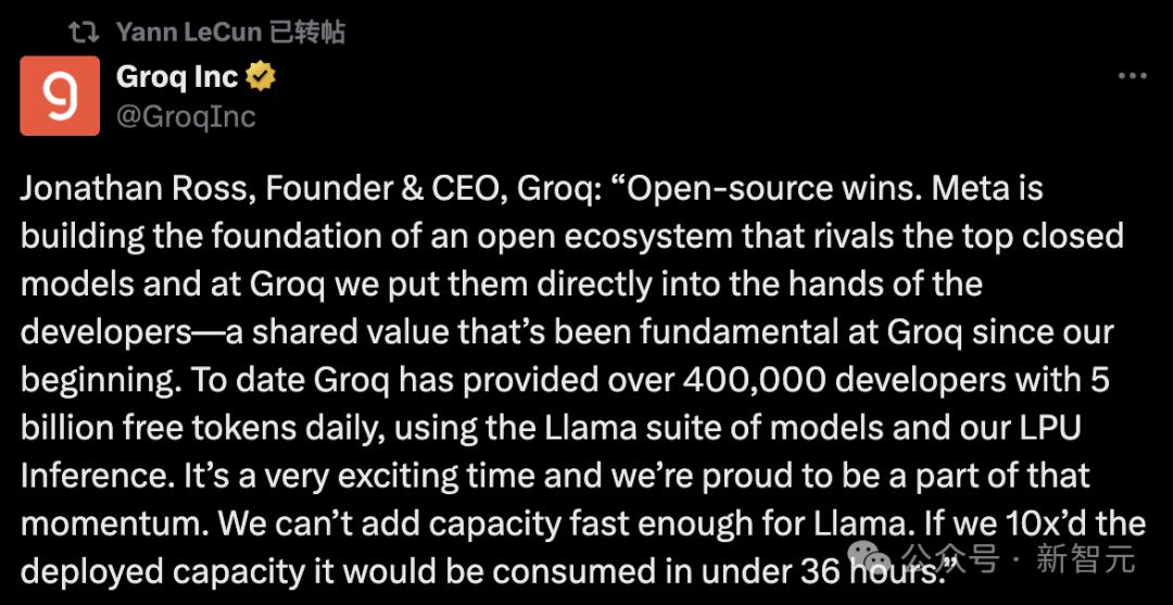 「到目前为止,Groq已经使用了Llama模型套件和自己的LPU Inference,每天为40多万开发人员提供50亿免费token」。