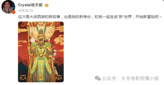 张天爱透露,“这次西游的新故事也是我的新身份。和我一起走进‘新’世界,开始新的冒险。~"