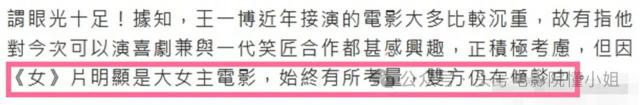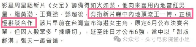 此外,香港媒体还报道称,周星驰电影近年来一直喜欢与内地当红男明星合作。这一次,王一博被邀请参加《女足》,但由于《女足》是一部大女主角电影,双方仍在交谈。