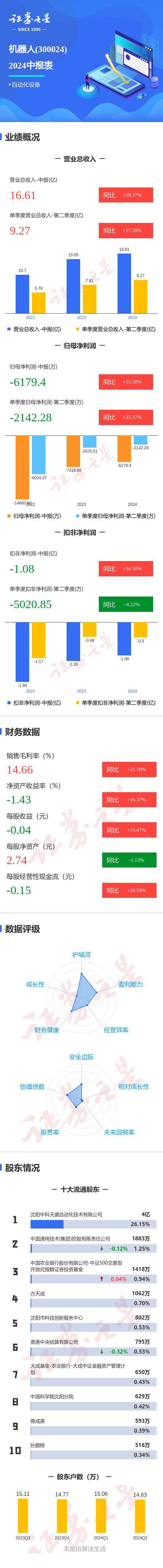 证券之星消息,机器人 2024 年中报告显示,公司主要收入 16.61 亿元,同比增长 10.37%;归母净利 -6179.41 一万元,同比增长 15.58%;扣非净利润 -1.08 亿元,同比增长 14.5%;其中 2024 2008年第二季度,公司单季度主营收入 9.28 亿元,同比增长 17.28%;单季度归母净利润 -2142.28 一万元,同比增长 25.37%;单季度扣除非净利润 -5020.85 一万元,同比下降 4.22%;负债率 投资收益60.55% -1301.35 一万元,财务费用 1954.06 万元,毛利率 14.66%。
