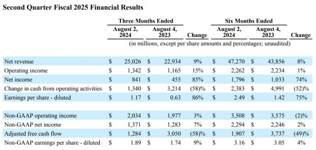 8 月 30 戴尔在日本发布 2025 财年第二季度业绩。财务报告显示,第二季度收入 250.26 市场预测,亿美元 241.3 去年同期,亿美元 229.3 一亿美元;净利润 8.46 市场预测,亿美元 7.15 去年同期,亿美元 4.62 亿美元;每股收益 1.17 市场预测,美元 1.19 去年同期的美元 0.63 美元;调整后的运营利润 20.3 亿美金,分析师预期 18.5 亿美金。